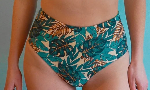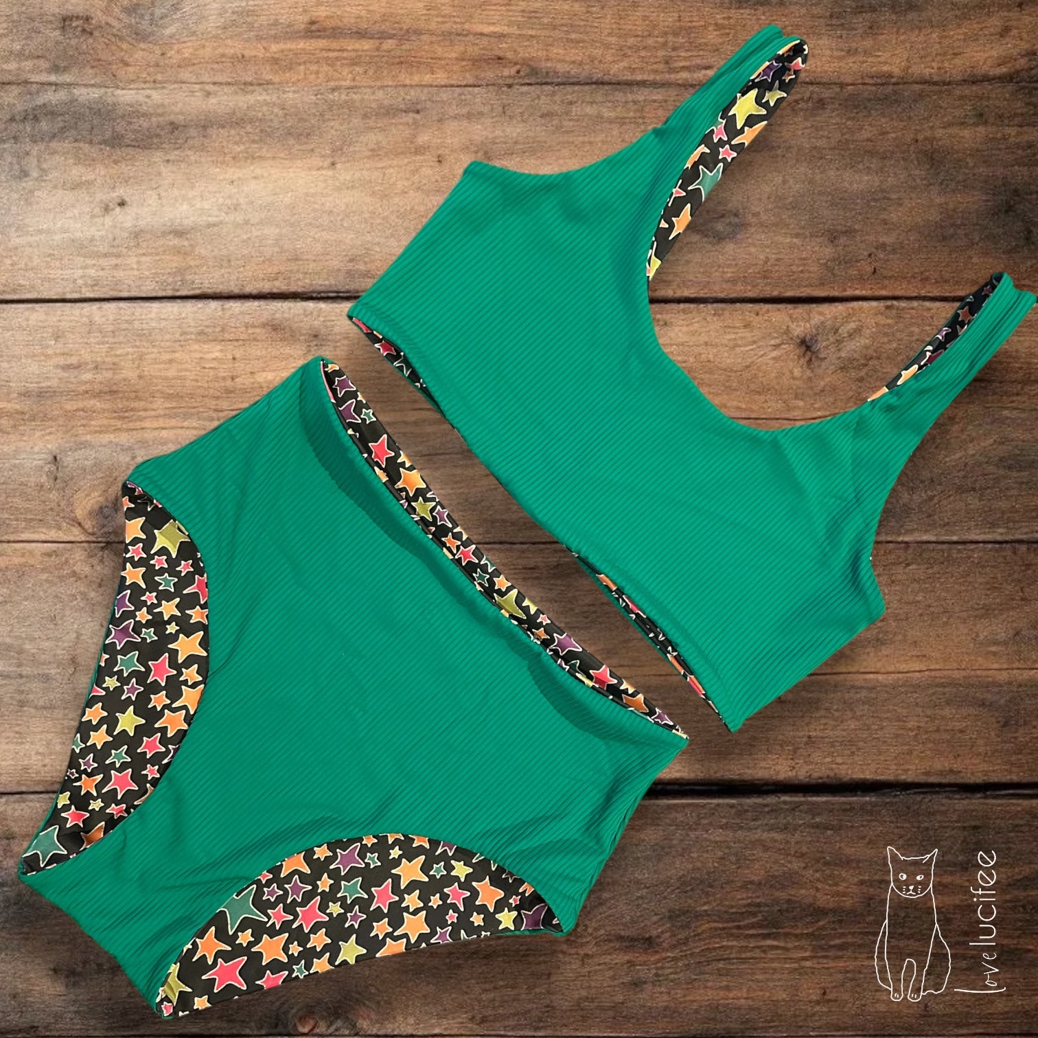 The custom adult riot bottom is a made to order reversible moderate coverage high rise swim bottom with a clean finish and fully encased swim elastic. Available to add picot lace trim at waist and leg openings.